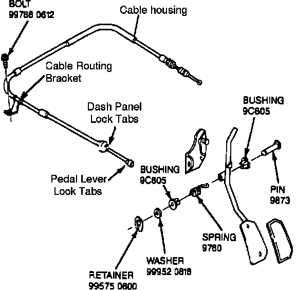 4. Disconnect the cable from the pedal lever assembly, inside vehicle, by squeezing the lock tabs together.