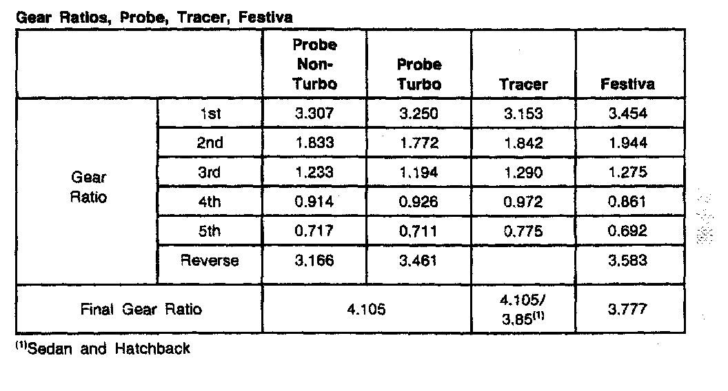 MTX 5-spd M/T, Gear Ratios (Probe/Tracer/Festiva):