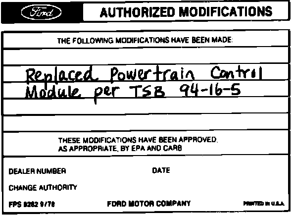 Obtain an Authorized Modifications Decal and list the date, dealer number, and summary of alterations performed. Select a prominent place adjacent to the Vehicle Emission Control Information Decal suitable for installing the Authorized Modifications Decal. Clean the area, install the decal, and cover it with a clear plastic decal shield.