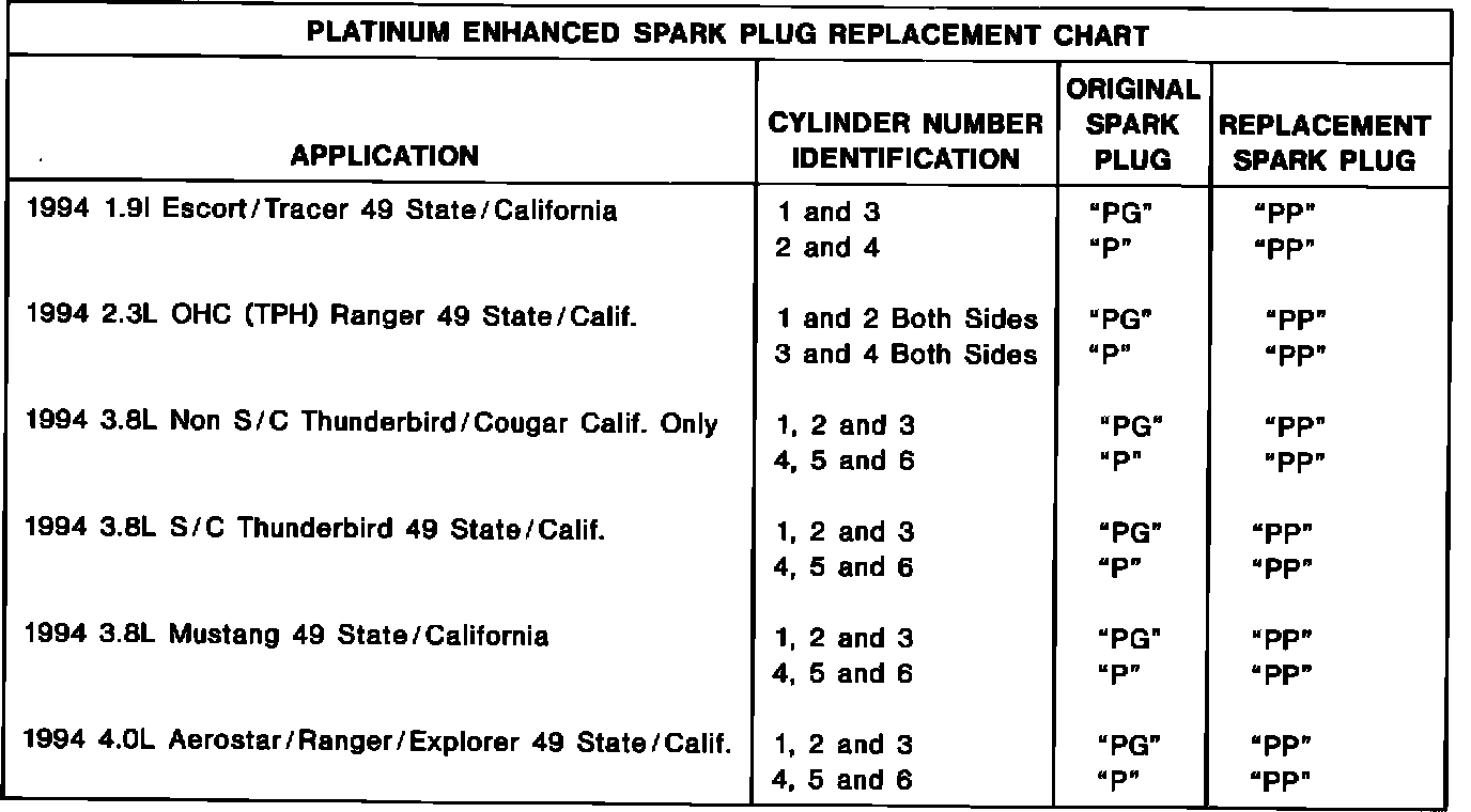 ^ IGNITION SYSTEM - ELECTRONIC IGNITION (EI) PLATINUM ENHANCED SPARK PLUGS - 1.9L, 2.3L OHC (TPH), 3.8L, 4.0L ENGINES