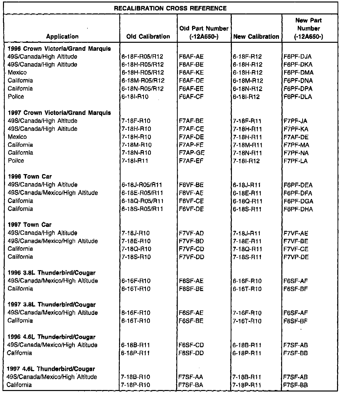 9. For all 1996-97 Town Car, Crown Victoria/Grand Marquis, Thunderbird/Cougar vehicles, check emissions decal to verify vehicle has the latest calibration. If it does not, reprogram the Powertrain Control Module (PCM) to the new calibration level using Service Bay Diagnostic System (SBDS) or New Generation Star (NGS) Tester with latest CD-ROM. Refer to the Recalibration Cross Reference Chart for the correct PCM calibration.