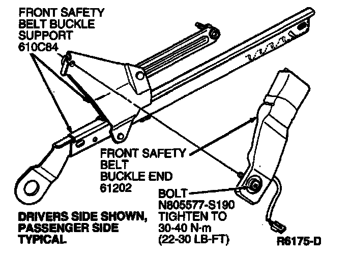 4. Remove front safety belt buckle end assembly (on LH side of vehicle, disconnect safety belt warning chime wiring from floorpan wiring).