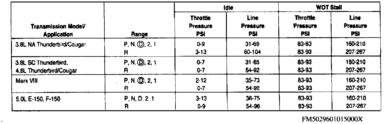 LINE PRESSURE TESTCAUTION: Perform the line pressure test prior to the stall speed test. If line pressure is low at stall, do not perform stall speed test, as transmission damage will occur. Do not allow engine to run at Wide Open Throttle (WOT) for more than 5 seconds.