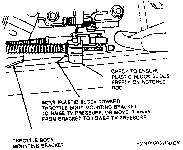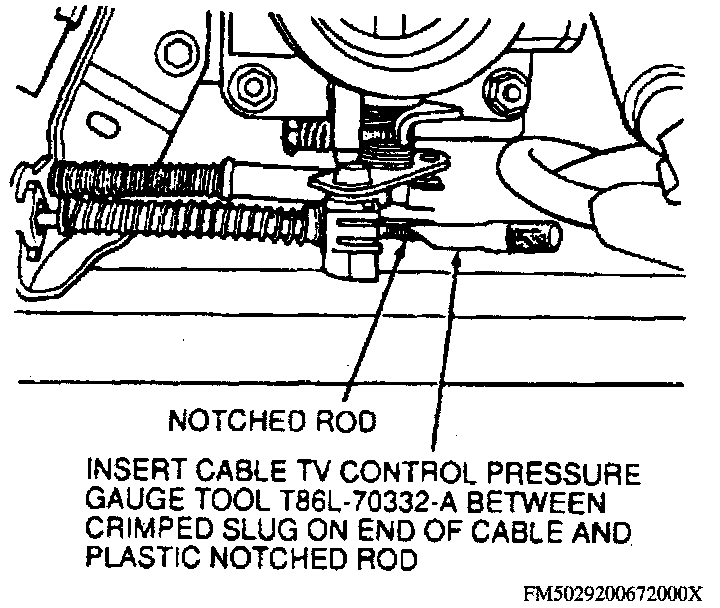 THROTTLE VALVE PRESSURE ADJUSTNOTE: This procedure requires the use of Throttle Valve (TV) Pressure Gauge Set (0-60 psi) tool No. T86L-70002-A or equivalent. The results of the adjustment procedure depends on the accuracy of the pressure gauge. The pressure gauge should have eight feet of flexible hose to make the gauge accessible while operating the engine.