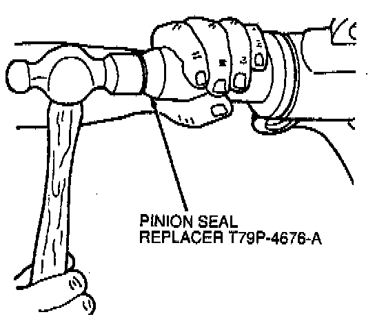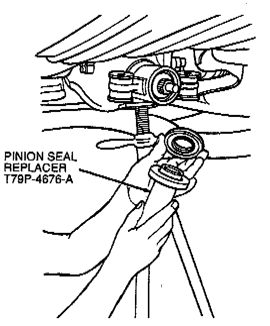 1. Make sure splines on the drive pinion stem are free of burrs. If burrs are evident, remove them by using a fine crocus cloth. Working in a rotating motion, wipe the pinion clean. Clean flange yoke seal seat surface and install rear axle drive pinion seal on Pinion Seal Replacer T79P-4676-A.