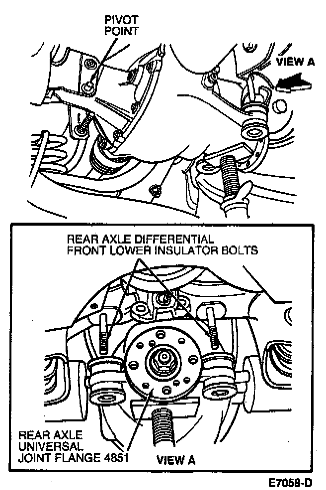 2. Place a screw-type jackstand under rear axle housing. Remove rear axle differential rear insulator to axle housing cover retaining bolts and nuts.