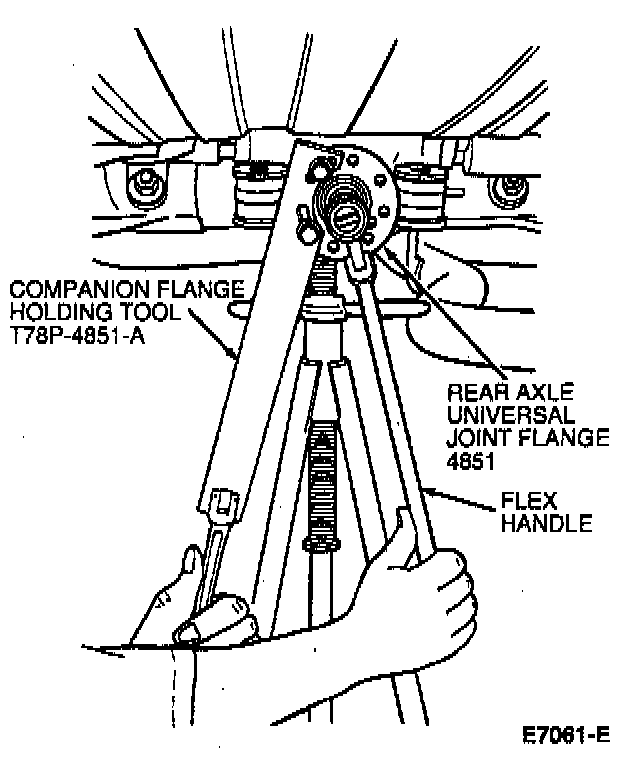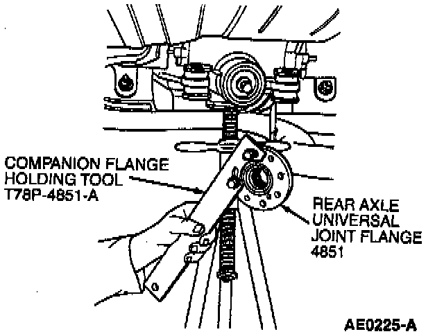 10. While holding rear axle universal joint flange with Companion Flange Holding Tool T78P-4851-A, remove pinion nut.