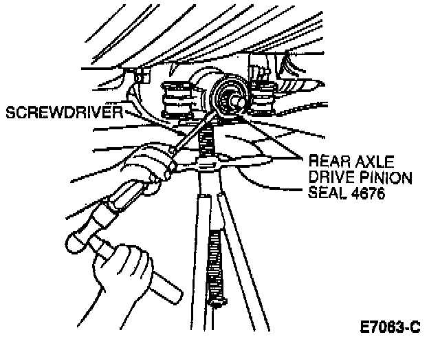 12. Place a drain pan under the rear axle housing. Position screwdriver under flange of rear axle drive pinion seal and strike with hammer to wedge screwdriver blade between metal flange of rear axle drive pinion seal and rear axle housing.
