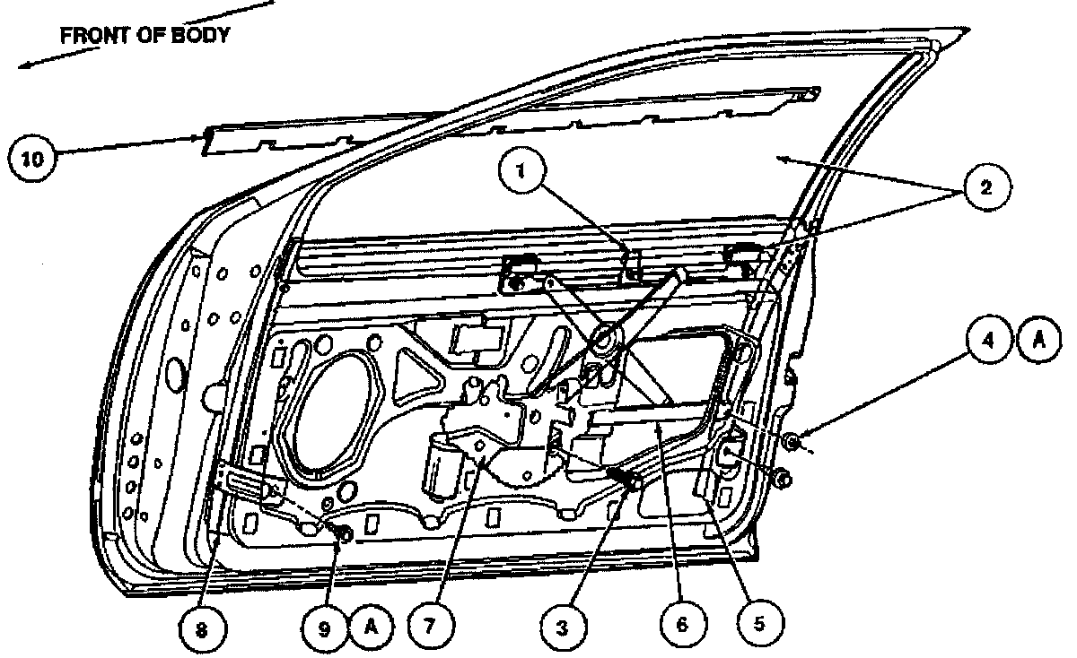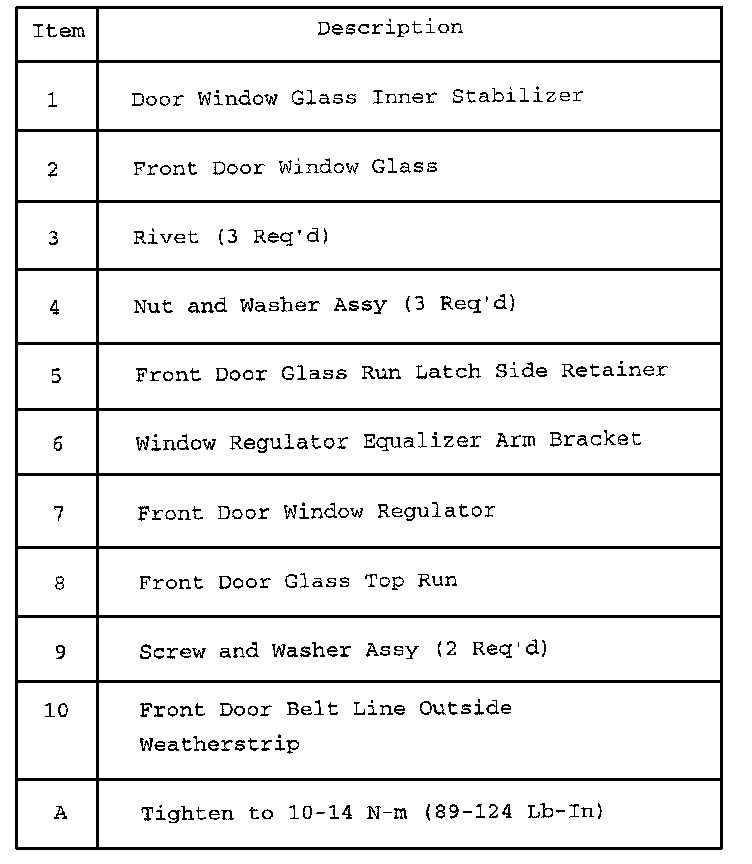 6. Remove the three rivets and one nut and washer assembly attaching front door window regulator to door inner panel as follows: