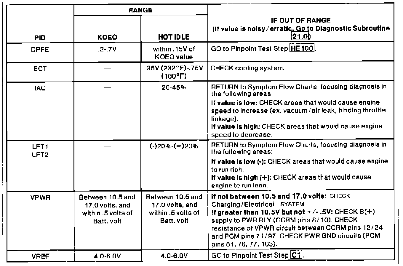 - Access each PID listed in chart. Check to see if all PID values are in the range given.