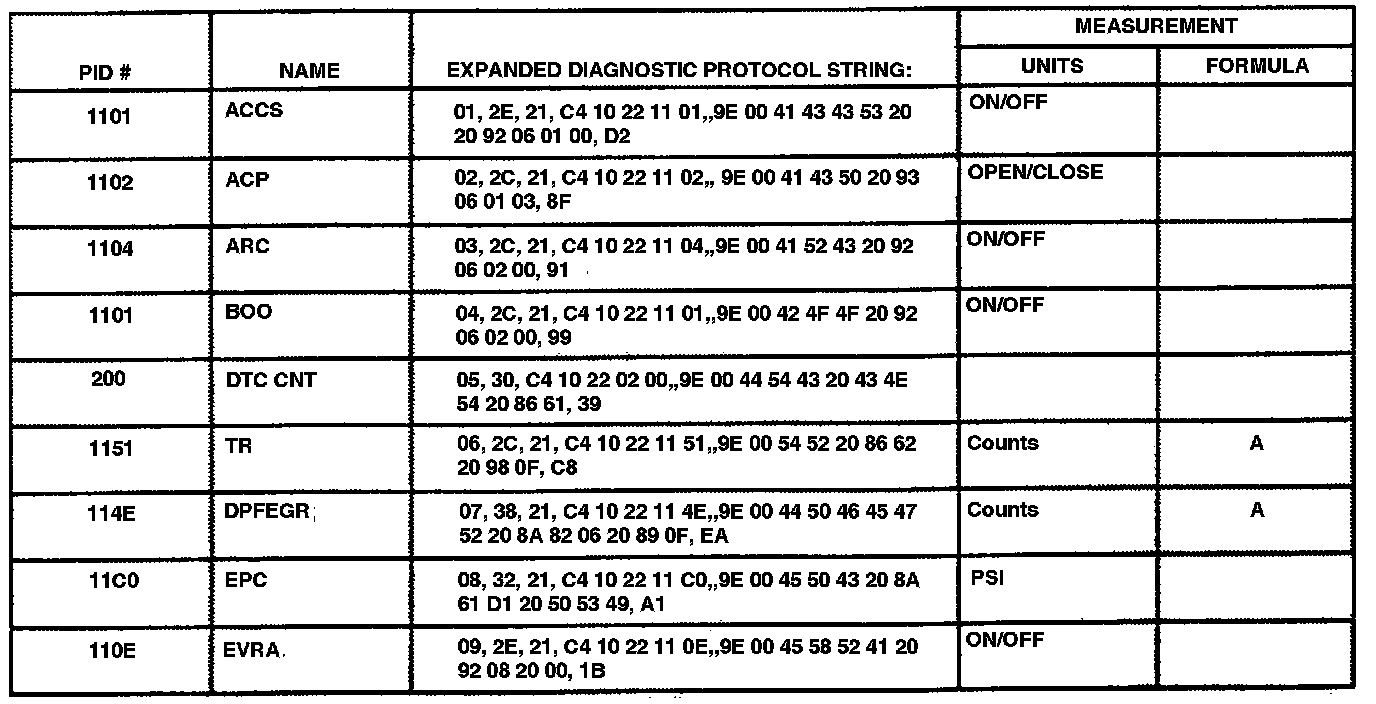 The table lists the string of characters entered in a generic scan tool when accessing the enhanced diagnostic PID information that may not be common on all OBD II vehicles.