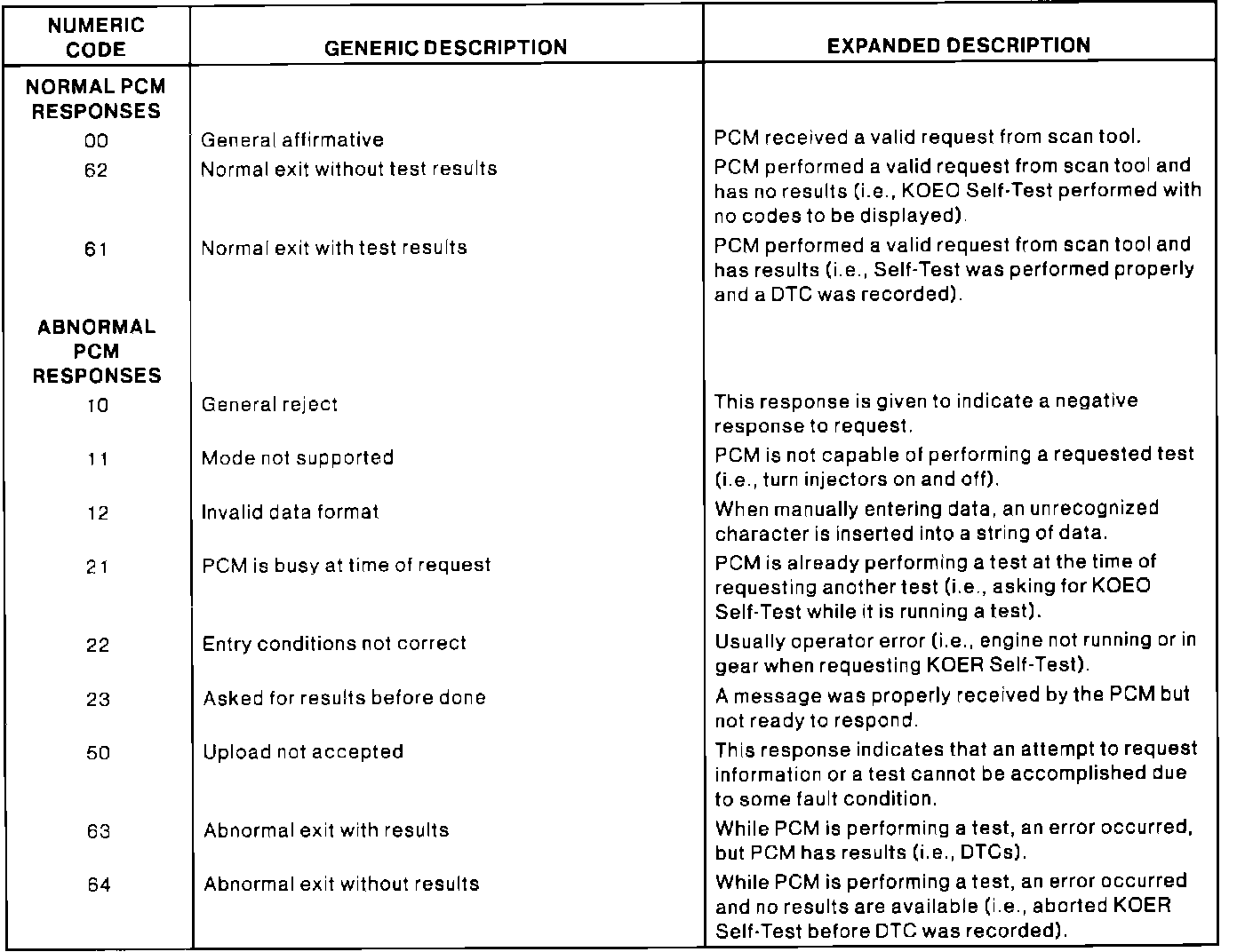 Listed are the numerous codes and generic descriptions a scan tool may display when trying to perform some PCM operations:
