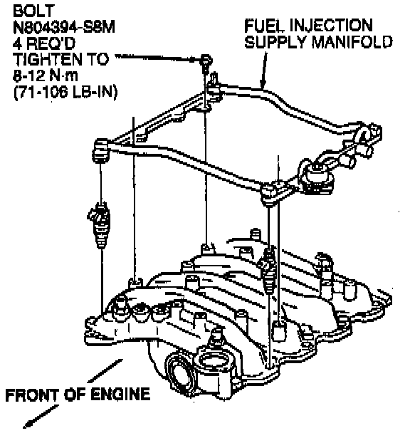 2. Install retaining bolts while holding fuel injection supply manifold down. Tighten retaining bolts to 8-12 Nm (71-106 lb in).
