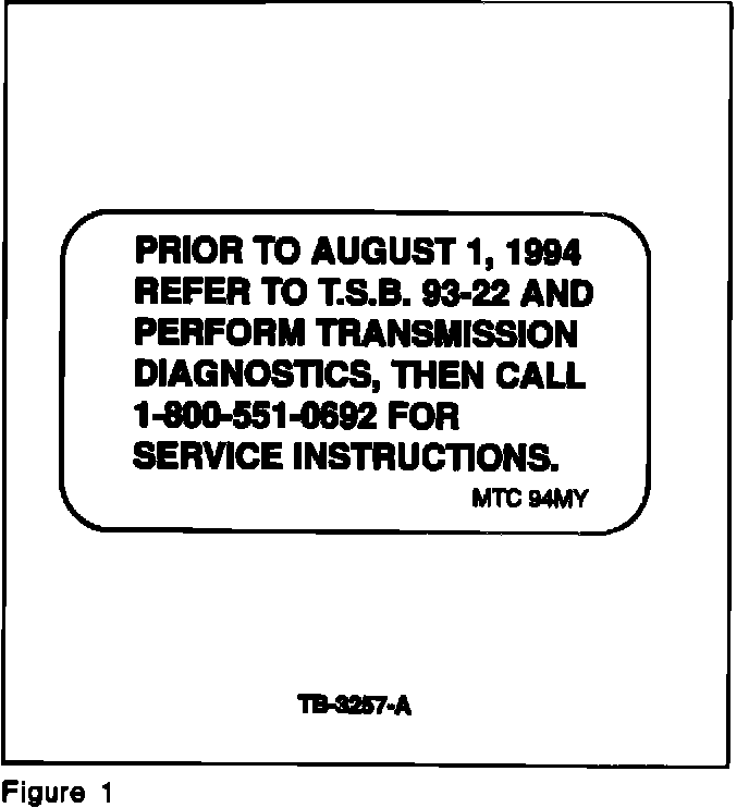 The AODE and 4R70W transmissions will be available October 1993, in the 1994 Thunderbird/Cougar, Mustang, Econoline and F-Series. About 30,000 transmissions will have an orange "Service" tag on the bottom of the oil pan. The orange tag refers to this TSB (93-22) and provides a toll free telephone number for service direction. Some transmissions may have an orange "Service" tag that refers to TSB 93-20. This is not correct. Refer to TSB 93-22 and Figure 1.