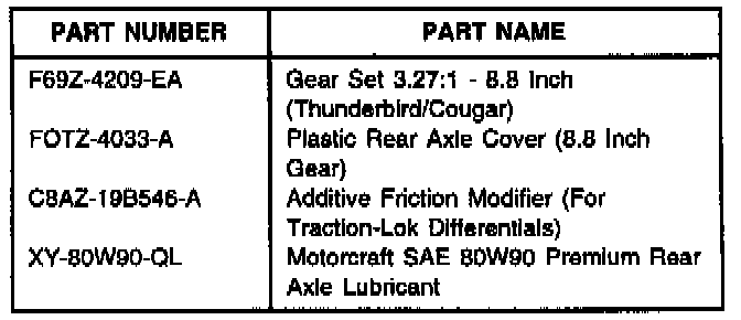 Select the appropriate ring and pinion set from the Parts Block listed below and replace the ring and pinion set. The revised ring and pinion should reduce the possibility of noise. Refer to the appropriate year Thunderbird/cougar Service Manual and the following text for removal and installation procedures.