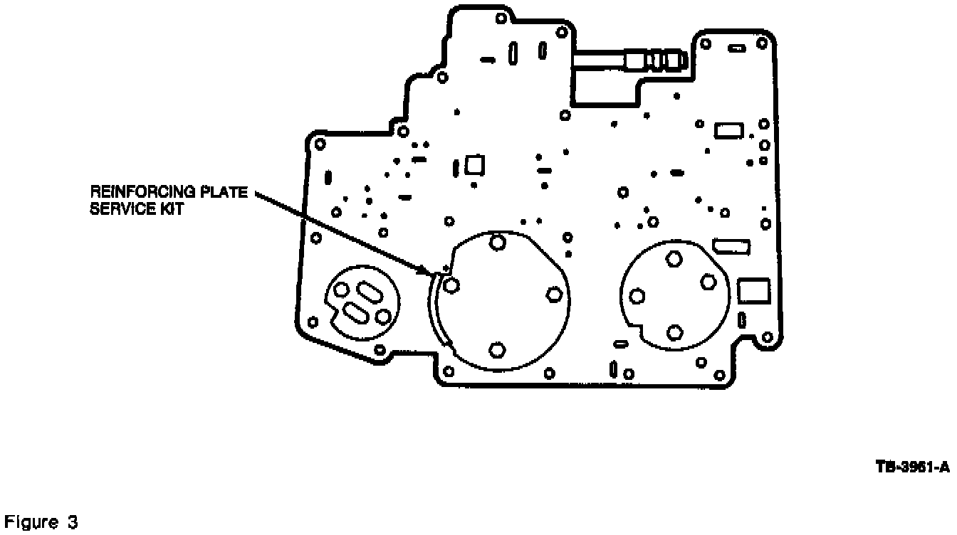 5. When the main control is removed for service, check the large valve body reinforcing plate. If it is the original plate (0.140" (3.5 mm) thick and no I.D. notch on the edge) install a main control reinforcing plate service kit (F4AZ-7F282-A) (Figures 3 and 4) and perform normal repair procedures. Refer to the following for kit contents.