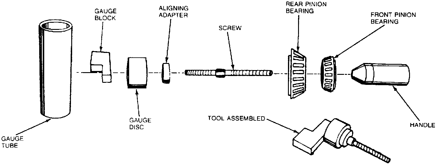 5. Use pinion shims to determine pinion depth by inserting shims between gauge block and gauge tube. The proper shim will fit with a slight drag. Do not attempt to force a shim between block and tube.