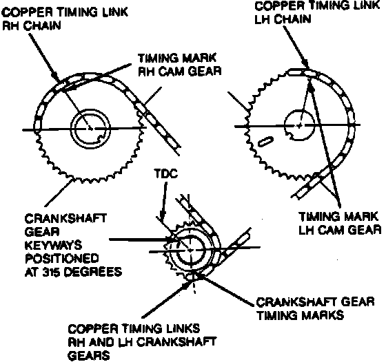 10. Install RH timing chain on camshaft gear. Ensure copper link is aligned with timing mark of camshaft gear.