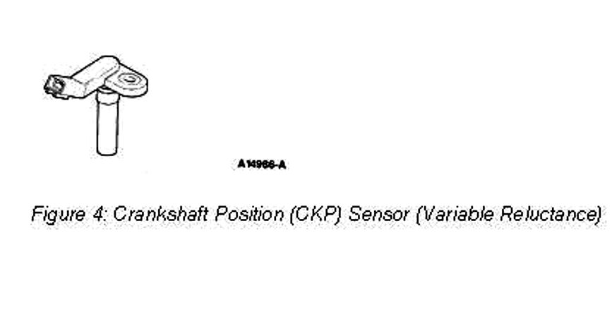 The CKP sensor is a passive electromagnetic device which senses movement of a 36 minus one-tooth wheel located behind the crankshaft pulley. An AC voltage signal is generated which increases with engine rpm and provides engine speed and crankshaft position information to the ICM.