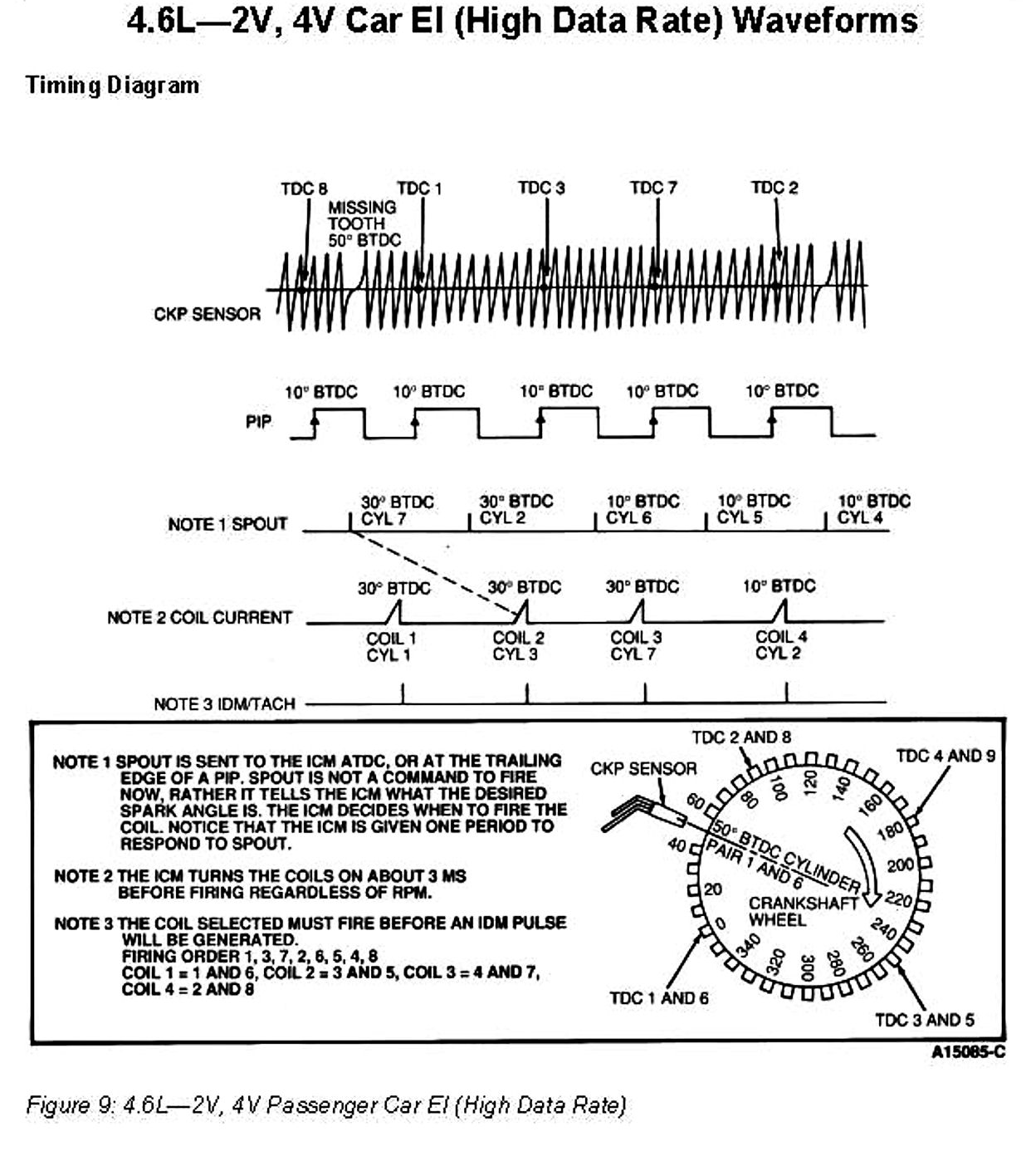 The EI (High Data Rate) System operates by sending crankshaft position information from the Crankshaft Position Sensor to the ICM. The ICM generates a PIP signal and sends it to the PCM. The PCM sends a SPOUT signal containing advance or retard timing information back to the ICM. The ICM processes the CKP and SPOUT signals and decides which coils to fire. In addition, the ICM generates an Ignition Diagnostic Monitor (IDM) signal to the PCM which is used to indicate a failure mode and also provide a tach output signal.