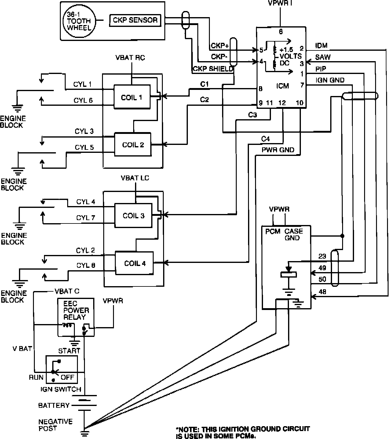 The PCM receives IGN GND and PIP signals from the ICM, then generates a SPOUT signal based upon engine speed, load, temperature and other sensor information. An IDM signal is received from the ICM to determine if an ignition failure mode should be recorded.