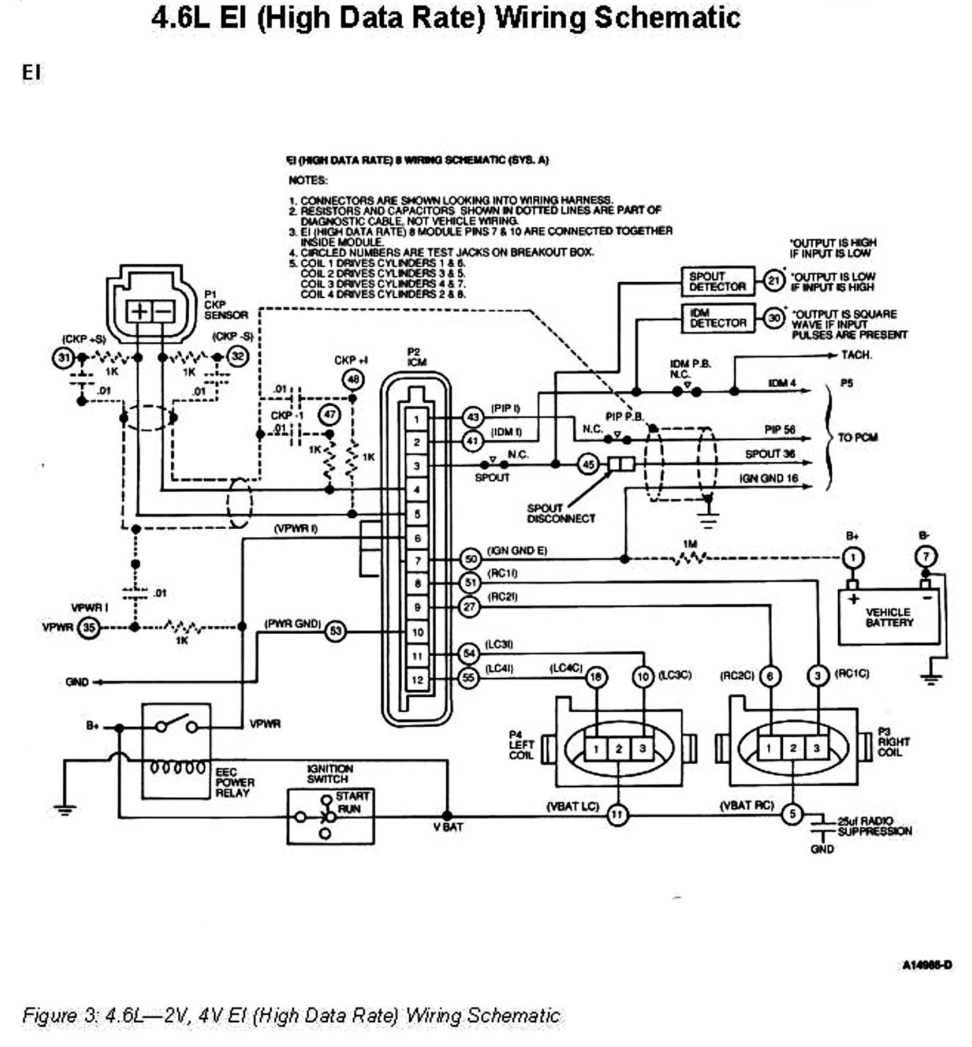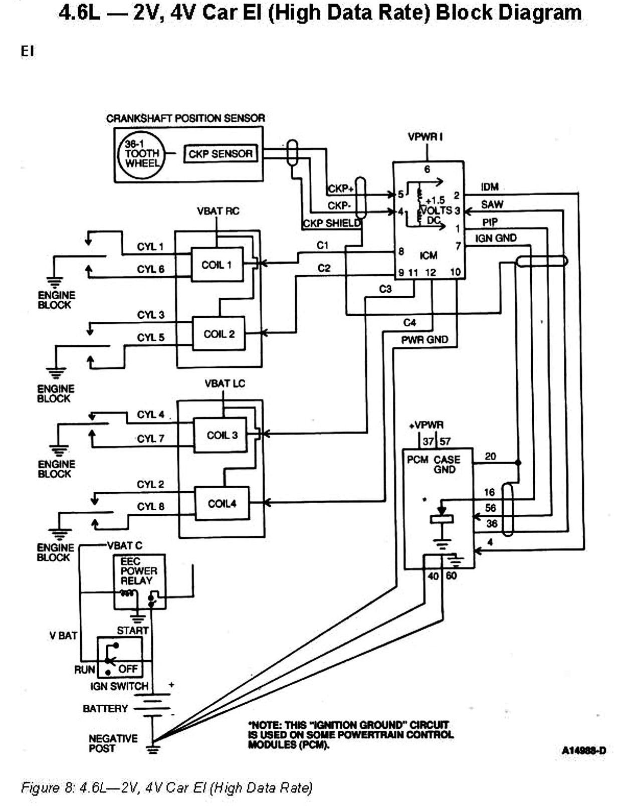 The 4.6L EI (High Data Rate) System consists of a Crankshaft Position (CKP) (variable reluctance) sensor, an Ignition Control Module (ICM), a Powertrain Control Module (PCM), and two four-tower Coil Packs.