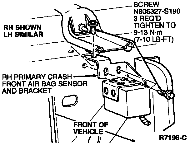 1. Position RH primary crash front air bag sensor and bracket or LH primary crash front air bag sensor and bracket in vehicle and secure RH primary crash front air bag sensor and bracket or LH primary crash front air bag sensor and bracket to RH or LH side of radiator support with retaining screws. Tighten screws to 9-13 Nm (7-10 lb-ft).