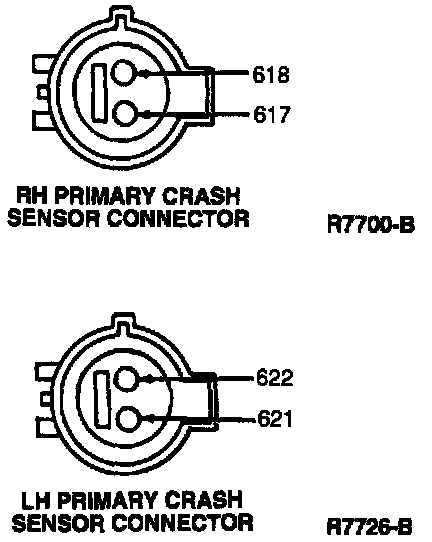 9. Using a 152 mm (6 inch) length of bared wire, short the 617 (PK/O) or 621 (W/Y) wire to ground. The air bags should deploy. If the air bags do not deploy, go to Procedure 2. Procedure 2 - Remote Deployment of Air Bags
