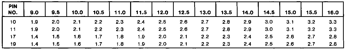 The resistors inside the air bag diagnostic monitor are connected to Pins 11 and 8, and 12 (Circuit 623, P/W) and are equal in value. Note that Circuits 614 (GY/O) and Circuit 623 (P/W) are tied together inside the safing sensor. Therefore, the two resistors inside the air bag diagnostic monitor are connected in parallel and will function the same as one resistor of half the original value. Current flows from Pins 1 and 6 through the resistors, out to Circuits 614 (GY/O) and 623 (P/W) on Pins 8, 11 and 12, through the LH kick panel safing sensor and out to the driver side air bag module and passenger side air bag module. Current flows through the driver side air bag module and into Pin 10 (Circuit 615, GY/W) and through the passenger side air bag module and into Pin 9 (Circuit 616 PK/BK). Current then flows from Pins 9 and 10 through the diodes inside the air bag diagnostic monitor and out to the primary crash sensors through Pins 17 and 19. The current flows through each primary crash sensor resistor and terminates at the case ground of each primary crash sensor. Pin 11 is the midpoint of the resistor network and voltage at Pin 11 will change with vehicle charging system voltage. The expected voltage at Pin 11 is shown in the table. The air bag diagnostic monitor measures the vehicle charging system voltage at Pin 13 (battery input). By measuring the voltage at Pin 13, the air bag diagnostic monitor can accurately predict what the voltage at Pin 11 should be in a normal functioning system.