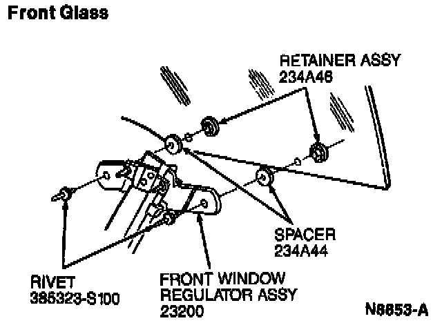 Do not attempt to pry out the rivets as damage to the front door window glass could result.
