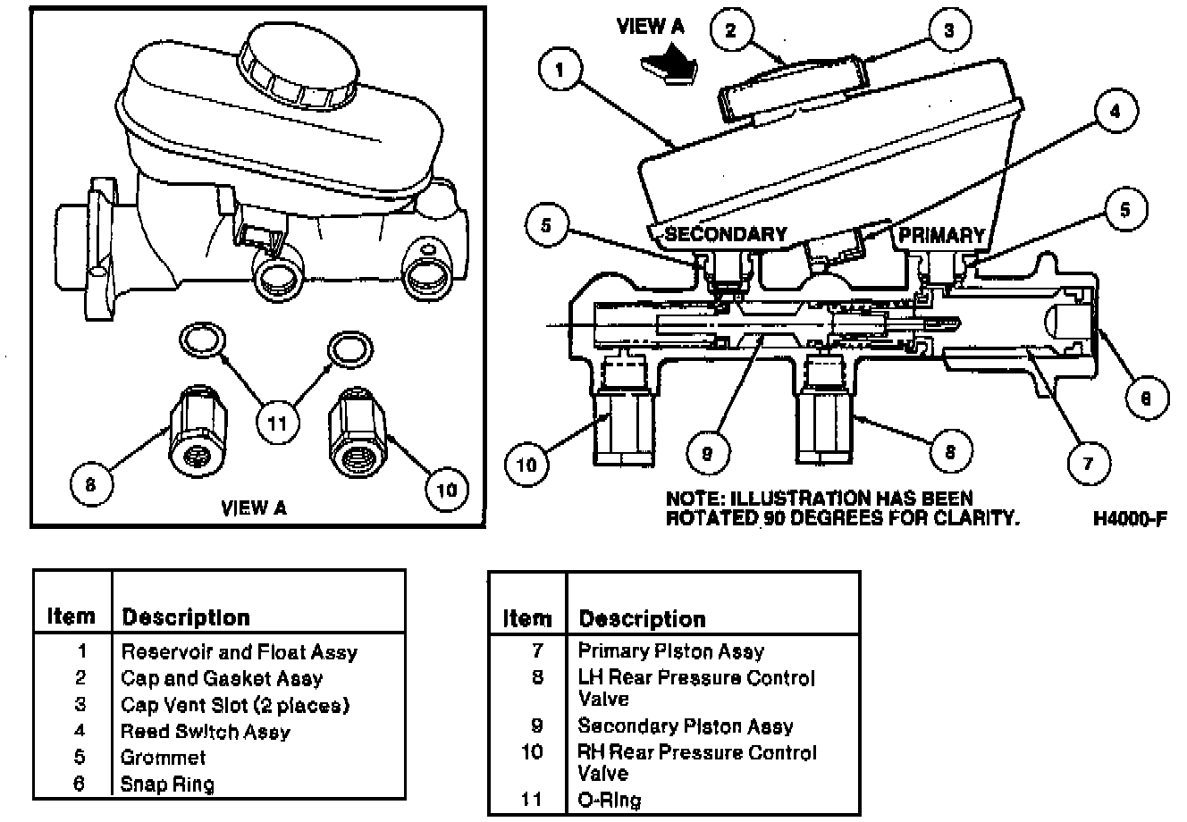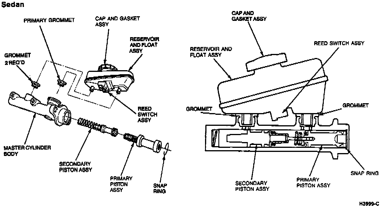NOTICE: This procedure is for the non Anti-Lock Brake System (ABS) master cylinder. The ABS master cylinder can not be overhauled due to internal adjustments which require extensive special tools and fixtures. If service is necessary the master cylinder must be replaced.