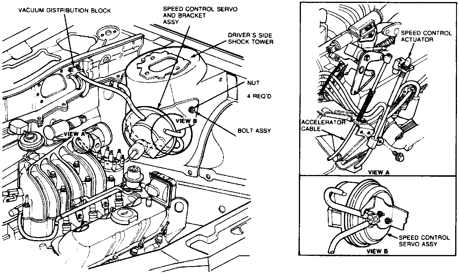 1. Disconnect speed control actuator cable from accelerator cable bracket and/or intake manifold support bracket.2. Disconnect speed control actuator cable with adjuster from accelerator cable.
