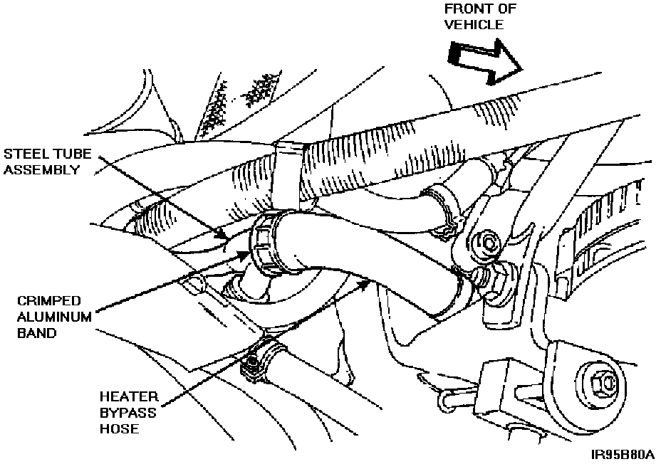 6. Cut the crimped aluminum band which secures the heater bypass hose to the steel tube assembly. Refer to Figure 1.