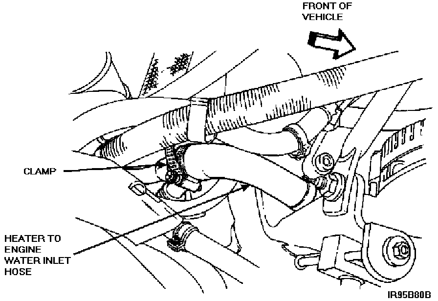 7. Disconnect the lower end of the heater bypass hose from the engine nipple. Retain the constant tension clamp.
