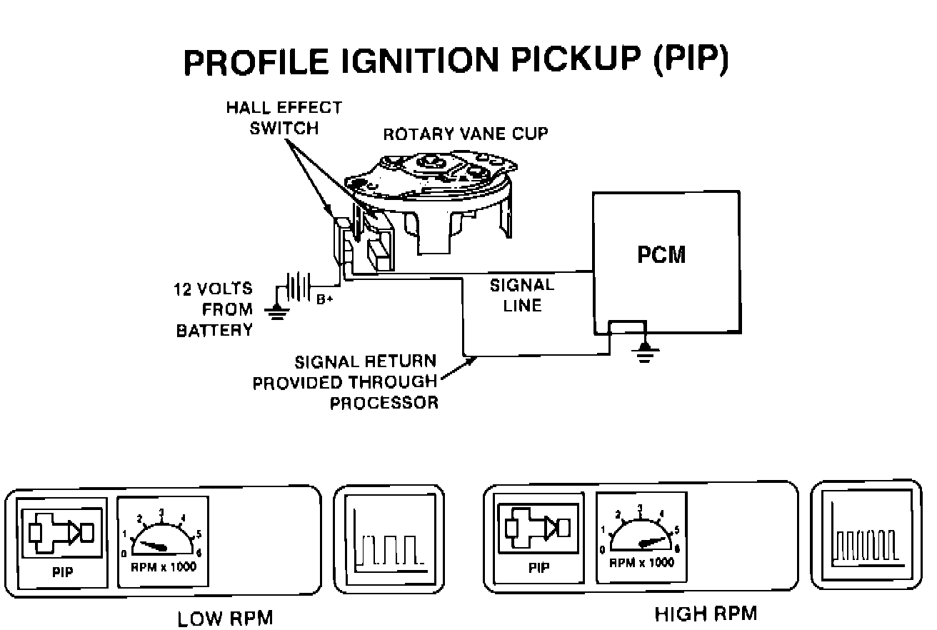The Profile Ignition Pickup (PIP) sensor is a Hall-effect type switch located in the distributor. It sends the Powertrain Control Module (PCM) information on engine speed and crankshaft position.
