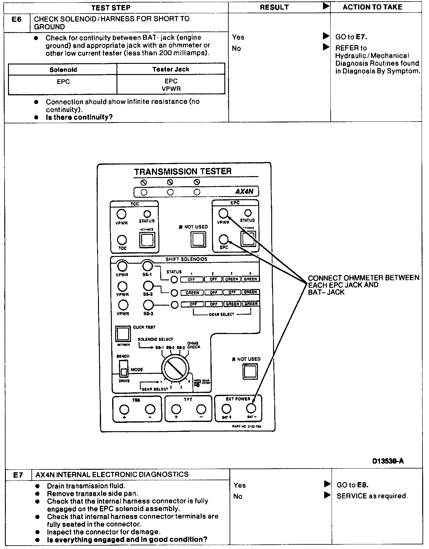CAUTION: To properly diagnose an AX4N transaxle, the Transmission Tester (007-0085C) must have been updated for AX4N compatibility. This update includes internal software and related components and a new cable and overlay. Inspect your tester for the "AX4N compatible" label located near the tester's cable connector. If the label is missing, do not use the tester to diagnose the AX4N transaxle. Contact Rotunda Equipment or Hickok Electrical for information on how to have the tester updated.