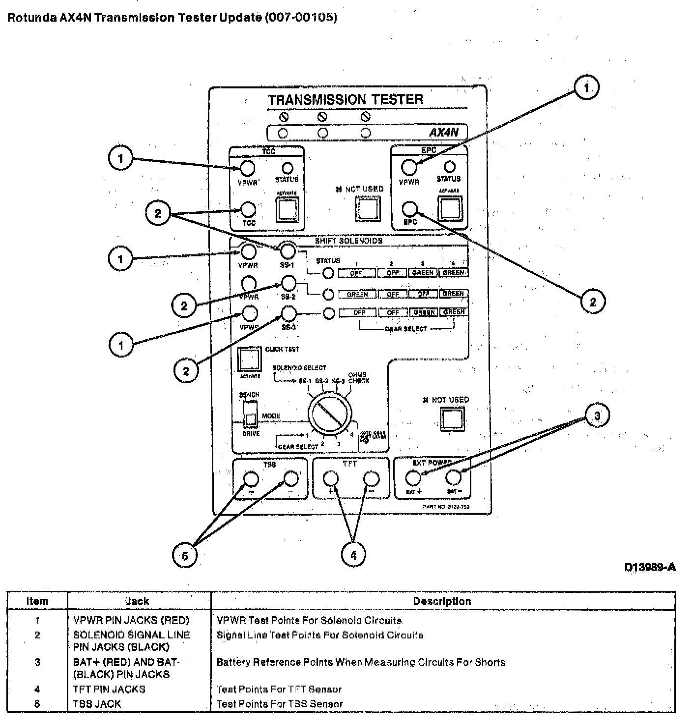 The Rotunda Transmission Tester 007-00085C or equivalent allows a technician to operate the electrical portion of the transaxle independent of the vehicle electronics to determine specific transaxle concerns.