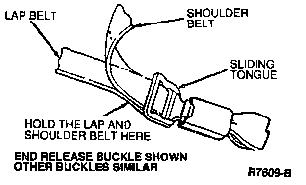 3. Pull on shoulder portion of the safety belt to make the lap portion fit snugly. Keeping lap safety belt snug, hold lap and shoulder belt portions of webbing together next to slip tongue and unbuckle safety belt.