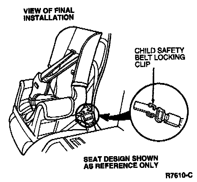 Use the following procedure to install the locking clip:1. Thread the safety belt webbing through the child safety seat according to the child seat manufacturer's instructions.