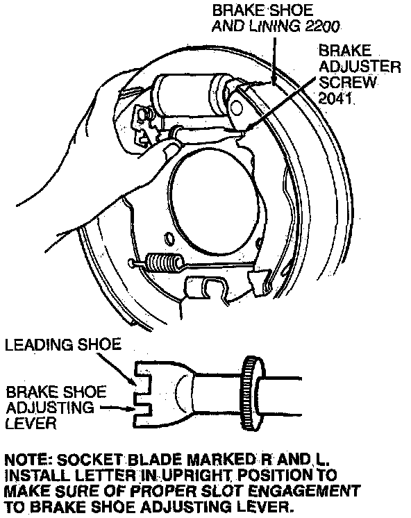 6. Install adjuster assembly to slots in brake shoes. Socket end must fit into slot in leading shoe (wider slot). Slot in adjuster nut must fit into slots in trailing shoe and parking brake lever.