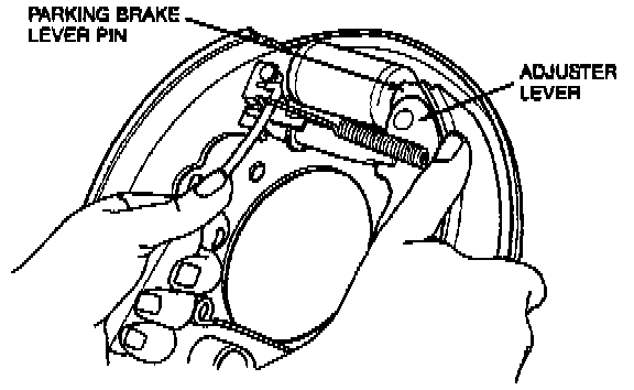 7. Install adjuster lever on pin on leading shoe and to slot in adjuster socket.