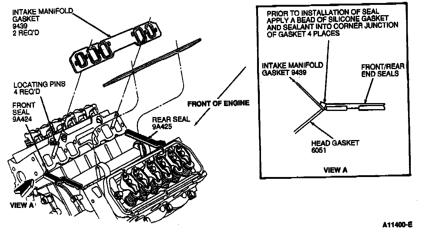 Note: Using solvent, clean sealing surfaces of cylinder heads and intake manifold before applying Silicone Sealer.