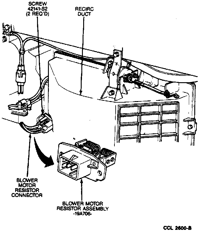 3. Remove the two heater blower motor switch resistor retaining screws and remove the heater blower motor switch resistor from the A/C evaporator housing.