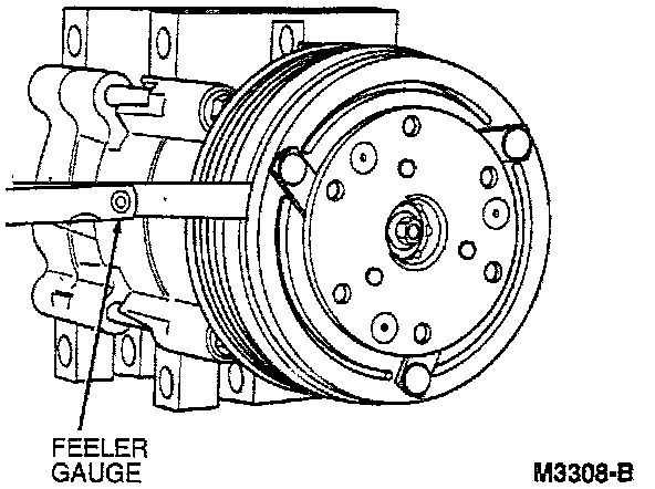 1. Check the air gap between the A/C clutch and the A/C compressor clutch pulley mating surfaces with a feeler gauge.