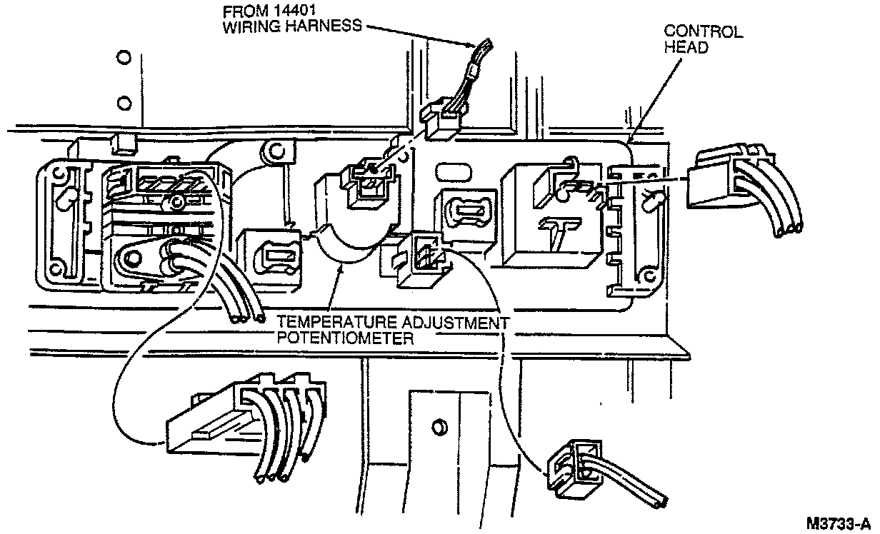 3. The temperature control knob (temperature adjustment potentiometer) which connects through an A/C electronic door actuator motor to the A/C air temperature control door of the heater air plenum chamber assembly by an A/C electronic door actuator motor. Movement of the control knob from COOL to WARM causes a corresponding movement on the A/C air temperature control door and determines the temperature that the system will maintain.