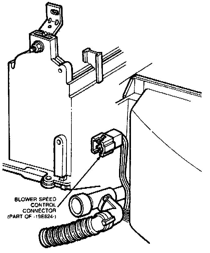 6. Remove the screws holding the electronic connector bracket to the A/C recirculating air duct. Disconnect the engine harness from the blower speed control connector. Release the three connectors from the bracket and remove the bracket. Disconnect the aspirator hose.