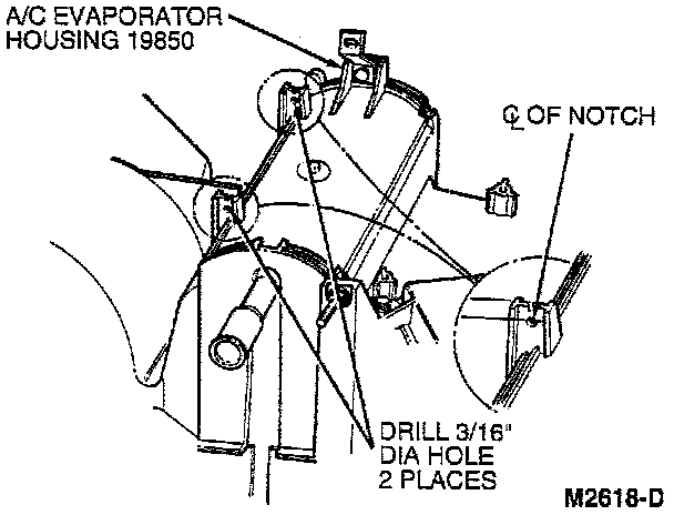 9. Drill a 4.75 mm (3/16 inch) hole in both of the upright tabs on top of the A/C evaporator housing.