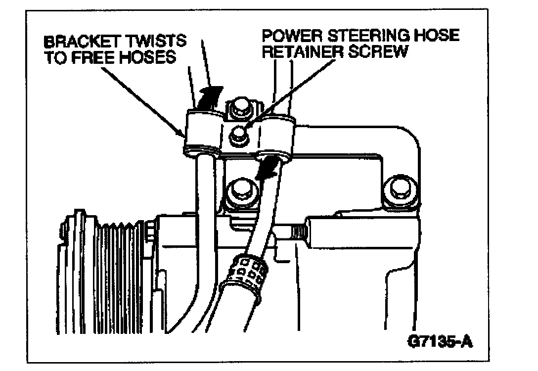 4. Loosen power steering hose retaining bracket screw, mounted to NC compressor, and turn retainer to allow hoses freedom of movement.