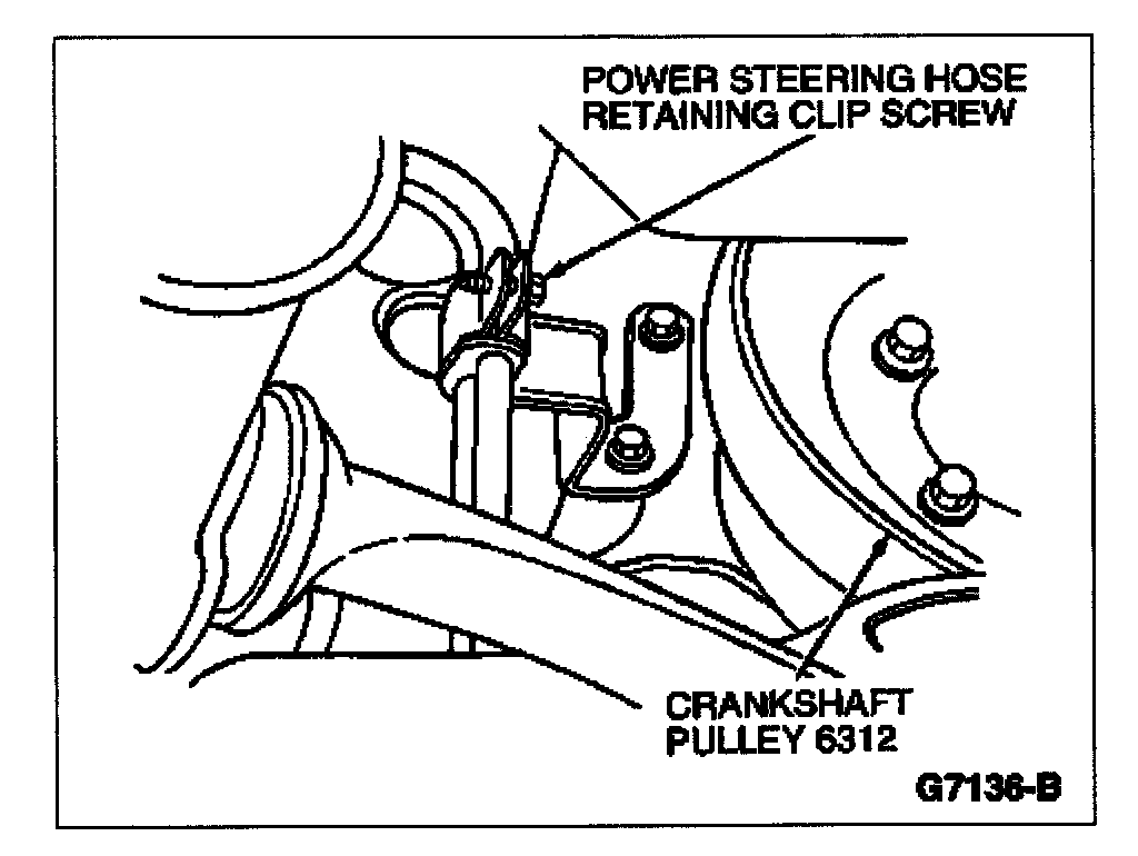 15. Remove power steering hose retaining clip screw located near crankshaft pulley to free hoses.