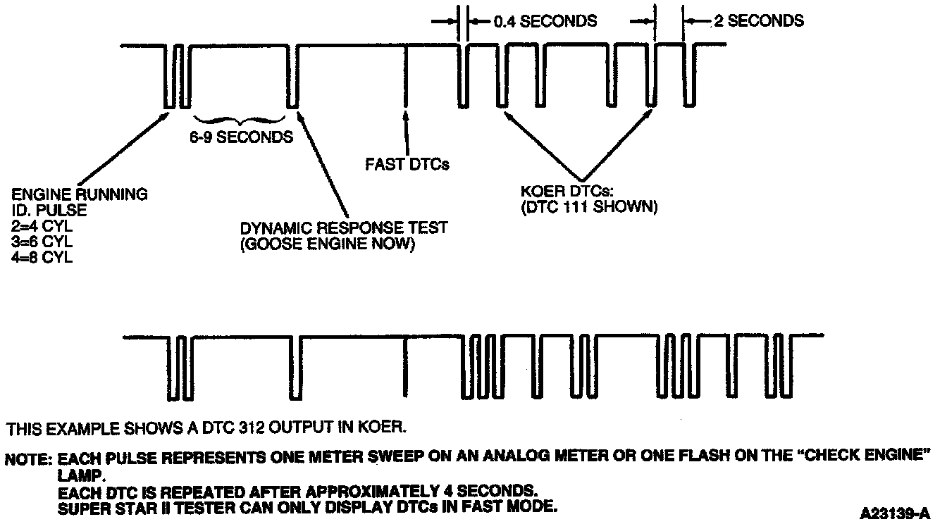 The dynamic response (goose) code is displayed during the KOER test only. It is displayed as single pulse (10 on a scanner) and is displayed after the engine ID code. When the "goose" code is displayed, the operator should briefly go to wide open throttle. This input is used to test the operation of the Throttle Position sensor, Mass Air Flow sensor, Manifold Absolute Pressure sensor, and Knock Sensor.